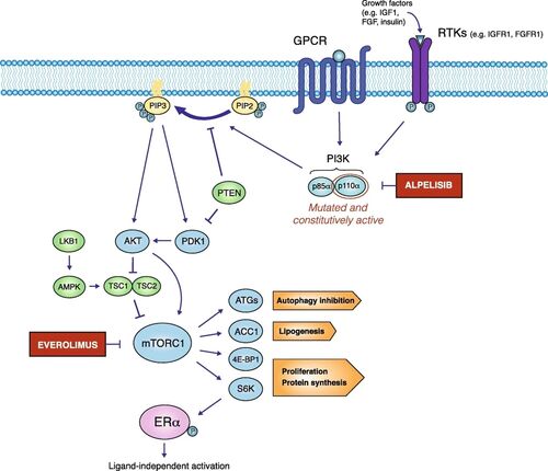 アロマターゼ阻害剤治療歴のあるエストロゲン受容体陽性HER2陰性転移性乳癌には、PI3K/AKT/mTORC1情報伝達系阻害剤、すなわちmTORC1阻害剤エベロリムスeverolimus あるいはPIK3CA阻害剤 alpelisibが選択できる。