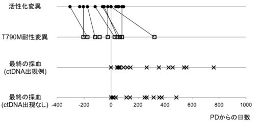 初期のオシメルチニブの適応である第1及び第2世代EGFR-TKI治療後T790M陽性非小細胞肺癌患者では、T790M変異検査が重要であった。T790Mをリキッドバイオプシーで検査する場合、最も成功率が高いタイミングはPD後約3ヶ月であった。