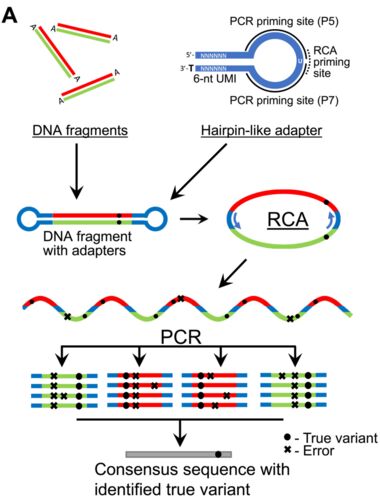 新たに開発されたstrand displacement polymeraseを用いたローリングサークル増幅に基づく高精度塩基配列決定法。Duplex sequencing の原理を応用している。